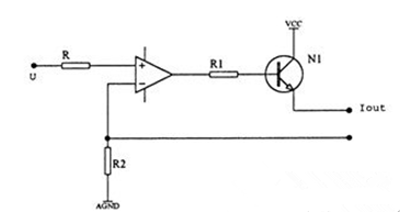 圖中N為運(yùn)算放大器,V為晶體三極管,擴(kuò)大運(yùn)算放大器的輸出電流。