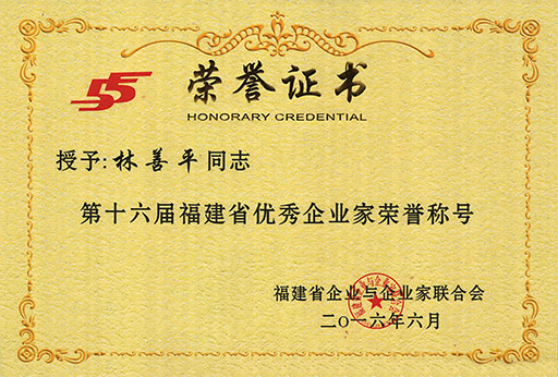 為弘揚優(yōu)秀企業(yè)家深化改革、科學(xué)管理、與時俱進(jìn)、勇于創(chuàng)新的開拓精神,激勵廣大企業(yè)家敢為天下先、愛拼才會贏的闖勁,為推動福建省產(chǎn)業(yè)轉(zhuǎn)型升級和經(jīng)濟持續(xù)健康發(fā)展建功立業(yè),近日,福建省企業(yè)與企業(yè)家聯(lián)合會組織開展了每兩年評選一次的福建省優(yōu)秀企業(yè)家評選工作,并于2016年6月24日決定授予98位企業(yè)經(jīng)營管理者“第十六屆福建省優(yōu)秀企業(yè)家”榮譽稱號,虹潤公司董事長林善平榮獲該榮譽稱號。