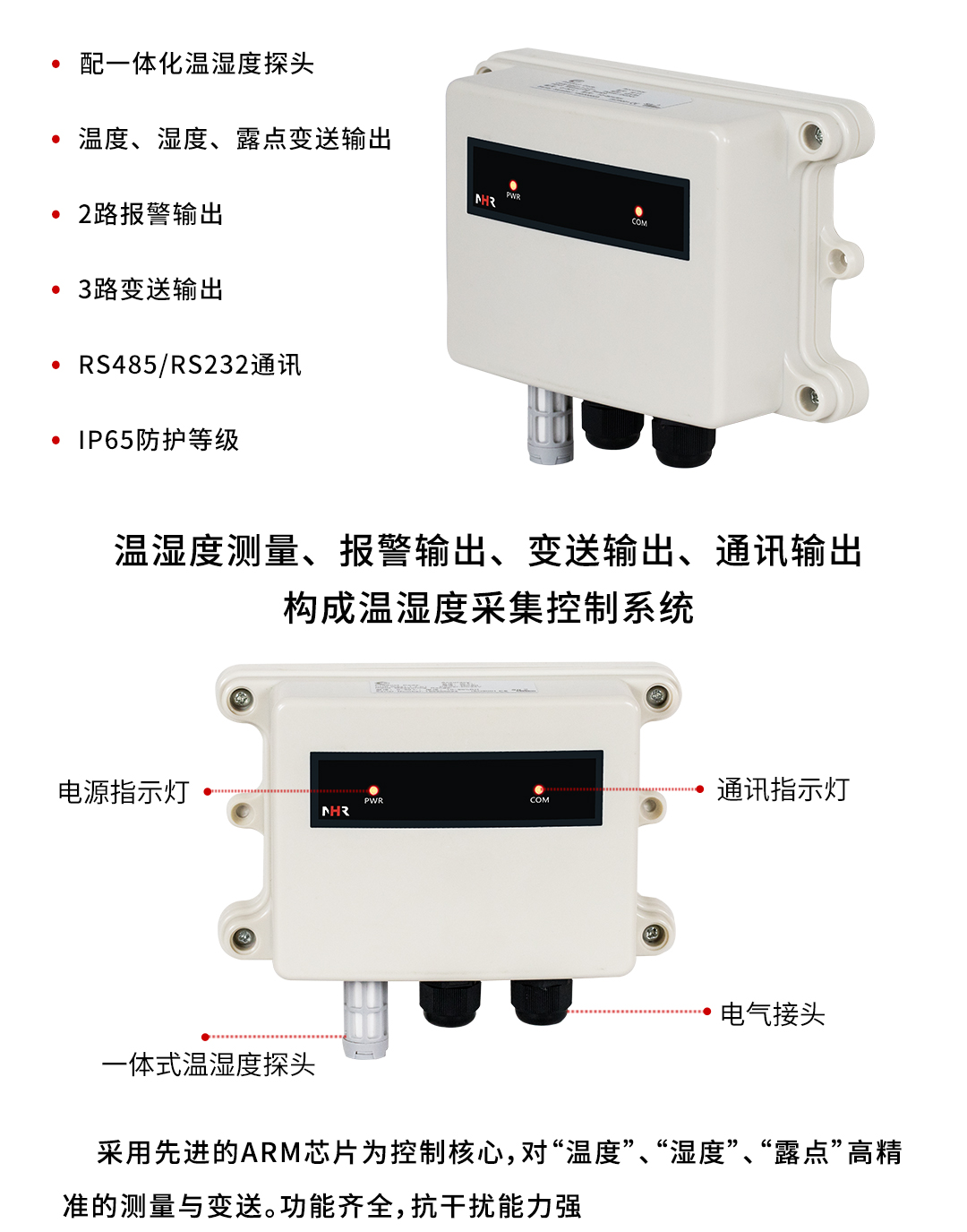虹潤公司是專業(yè)生產(chǎn)環(huán)境監(jiān)測儀表的國家專精特新“小巨人”企業(yè)。生產(chǎn)的一體式溫濕度變送器,具有溫度、濕度、露點高精準的測量與變送,報警繼電器輸出,RS485/RS232通訊,IP65防護等級等特點。產(chǎn)品獲得一種手持式低功耗溫濕度檢測儀、大屏幕溫濕度記錄儀等2項國家發(fā)明專利,主持起草物聯(lián)網(wǎng)智能溫度儀表通用技術(shù)條件、冷鏈溫度記錄儀等2項國家標準,以及通信系統(tǒng)多通道數(shù)據(jù)采集控制終端規(guī)范軍用標準,以及現(xiàn)場設(shè)備集成等5項智能制造國家標準,參與國際5G標準制定,取得溫濕度儀表等3項相關(guān)軟件著作權(quán)。產(chǎn)品廣泛應(yīng)用于工業(yè)現(xiàn)場、農(nóng)業(yè)大棚、倉儲物流、地下管廊、養(yǎng)殖孵化、配電機房等諸多領(lǐng)域。
