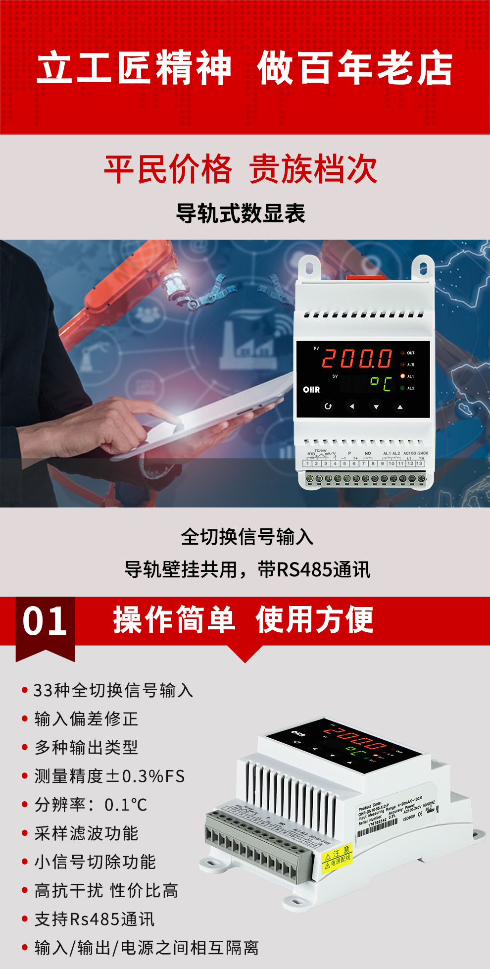 虹潤公司是專業(yè)生產數顯表的國家專精特新“小巨人”企業(yè),生產的導軌式數顯儀表,具有全切換信號輸入,導軌壁掛共用,全隔離設計,高抗干擾,變送輸出或RS485通訊等特點。產品獲得巡回檢測顯示方法及裝置、工業(yè)模塊的導軌式安裝結構等2項國家發(fā)明專利,主持起草工業(yè)過程控制系統(tǒng)用模擬輸入兩位或多位輸出儀表、物聯(lián)網智能溫度儀表通用技術條件等2項國家標準,,以及通信系統(tǒng)多通道數據采集控制終端規(guī)范軍用標準,參與國際5G標準制定,取得簡易數顯儀表等3項相關軟件著作權。產品廣泛應用于電力、石化、冶金、化工、造紙、食品、輕工、制藥、熱處理、水處理、機械配套等各種工業(yè)現(xiàn)場。