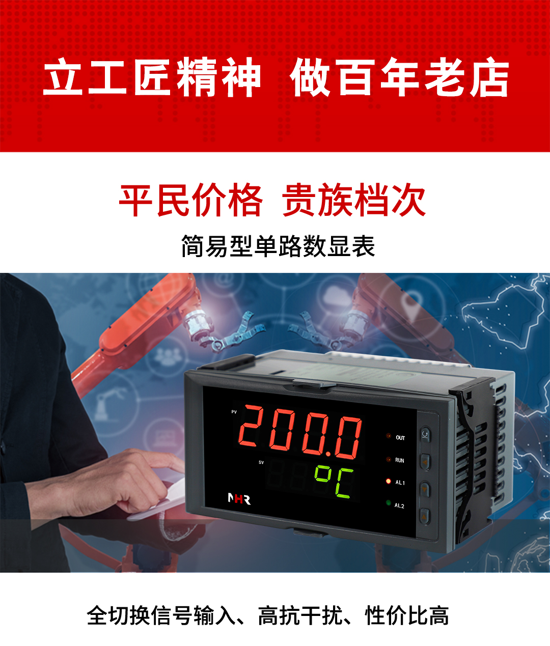 虹潤公司是專業(yè)生產(chǎn)數(shù)顯表的國家專精特新“小巨人”企業(yè),生產(chǎn)的簡易型數(shù)字顯示控制儀,具有全切換信號輸入,多種外形尺寸,高抗干擾,輸入/輸出/電源三隔離,性價(jià)比高等特點(diǎn)。該產(chǎn)品不僅通過德國萊茵 CE 認(rèn)證,還獲得巡回檢測顯示方法及裝置、儀表殼體等2項(xiàng)國家發(fā)明專利,主持起草工業(yè)過程控制系統(tǒng)用模擬輸入兩位或多位輸出儀表、物聯(lián)網(wǎng)智能溫度儀表通用技術(shù)條件等2項(xiàng)國家標(biāo)準(zhǔn),以及通信系統(tǒng)多通道數(shù)據(jù)采集控制終端規(guī)范軍用標(biāo)準(zhǔn),參與國際5G標(biāo)準(zhǔn)制定,取得簡易數(shù)顯儀表等3項(xiàng)相關(guān)軟件著作權(quán)。產(chǎn)品廣泛應(yīng)用于電力、石化、冶金、化工、造紙、食品、輕工、制藥、熱處理、水處理、機(jī)械配套等各種工業(yè)現(xiàn)場。