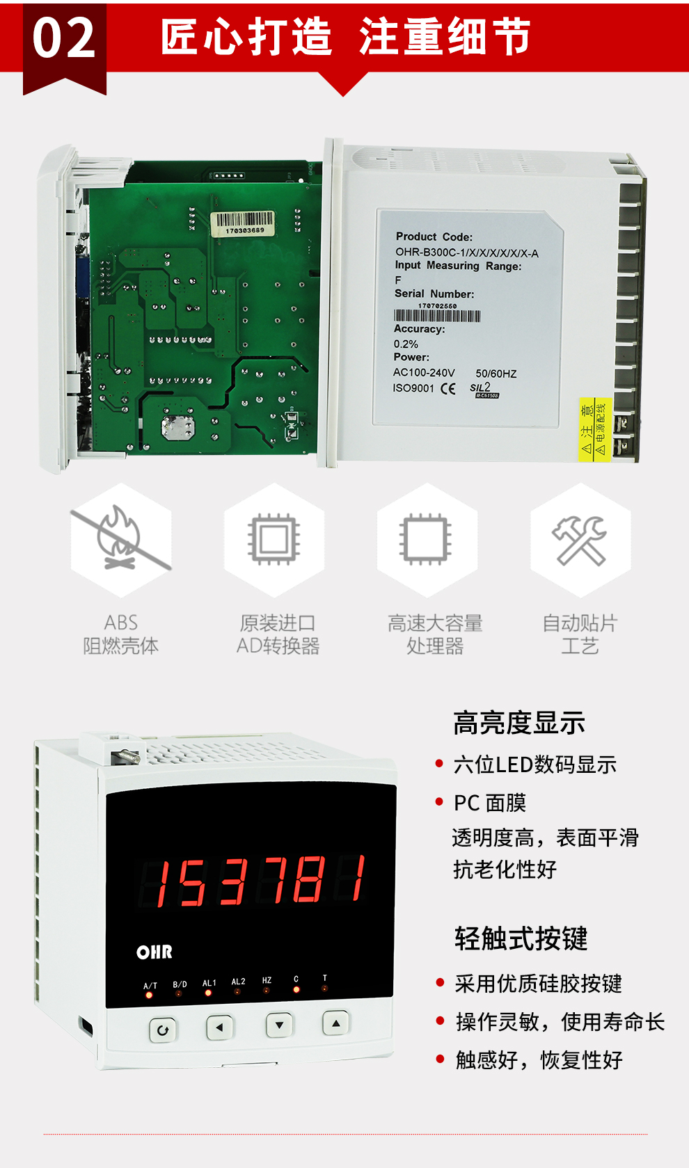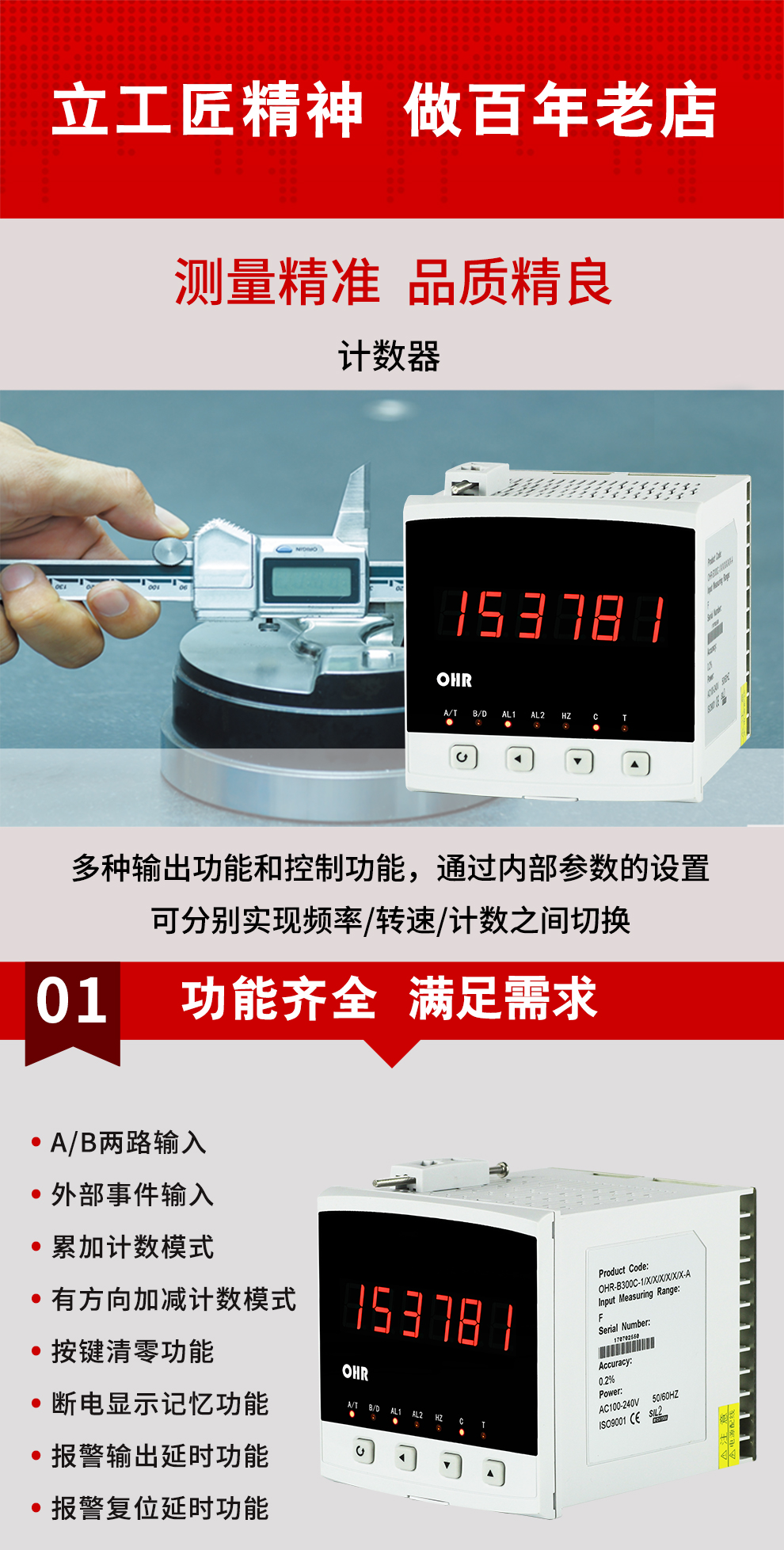 OHR-B300系列計數(shù)器采用全自動貼片封裝工藝,具有很強的抗干擾能力,并具有多種輸出功能和控制功能,多種計數(shù)模式,廣泛運用于電力、石化、冶金、輕工、制藥、航空等諸多領域。