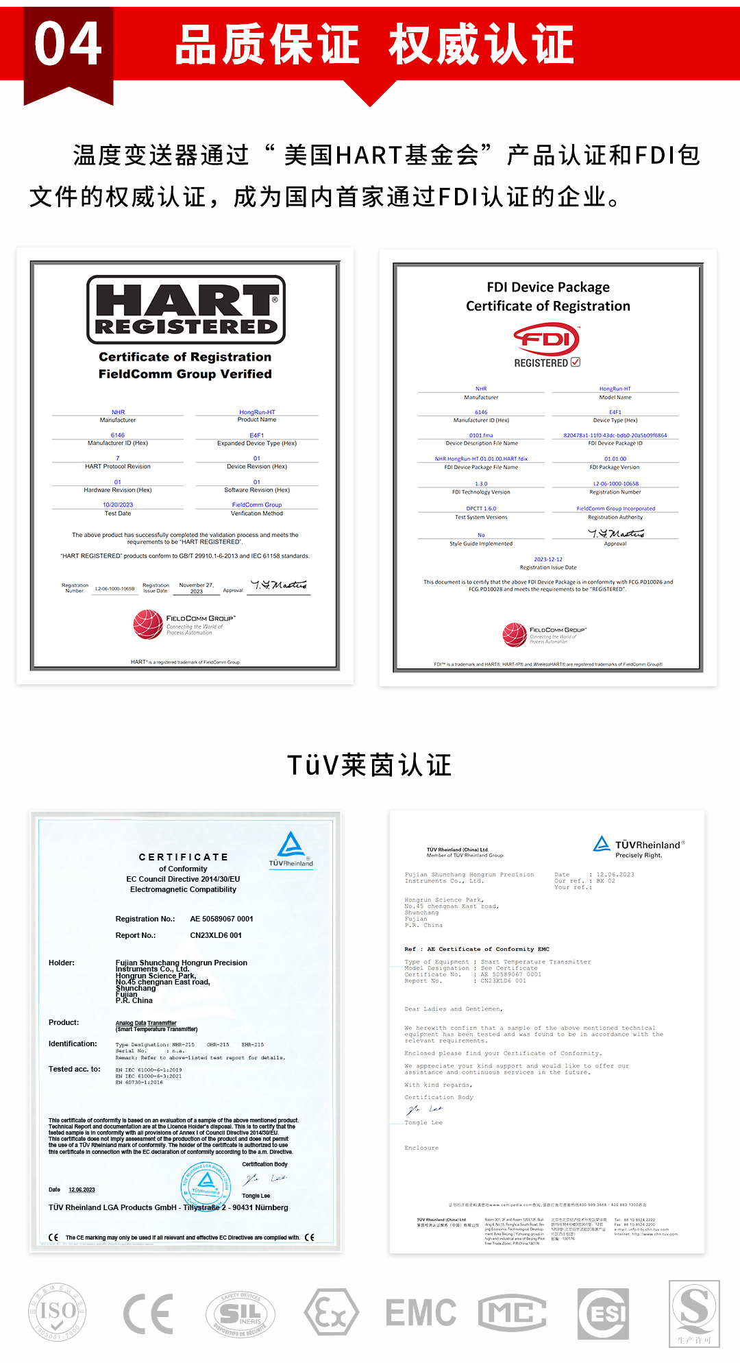 虹潤公司是專業(yè)生產(chǎn)溫度變送器的國家專精特新“小巨人”企業(yè)。生產(chǎn)的智能溫度變送器,具有適配各類溫度傳感器,精度高,通過編程線修改輸入信號類型及量程,高抗干擾,HART或485通訊等特點。該產(chǎn)品不僅通過HART基金會認(rèn)證、德國萊茵 CE 認(rèn)證與 SIL 功能安全認(rèn)證,還獲得具備減震抗干擾能力的溫度變送器、信號隔離器、一種二端子模塊、無源信號隔離器等4項國家發(fā)明專利,主持起草物聯(lián)網(wǎng)智能溫度儀表、現(xiàn)場設(shè)備工具(FDT)接口規(guī)范、工業(yè)過程測量和控制系統(tǒng)用溫度變送器等3項國家標(biāo)準(zhǔn),以及通信系統(tǒng)多通道數(shù)據(jù)采集控制終端規(guī)范軍用標(biāo)準(zhǔn),參與國際5G標(biāo)準(zhǔn)制定,取得HART溫度變送器、智能溫度變送器等3項相關(guān)軟件著作權(quán)。產(chǎn)品廣泛應(yīng)用于石油、化工、電力、冶金、制藥、食品、水處理等各種工業(yè)領(lǐng)域。