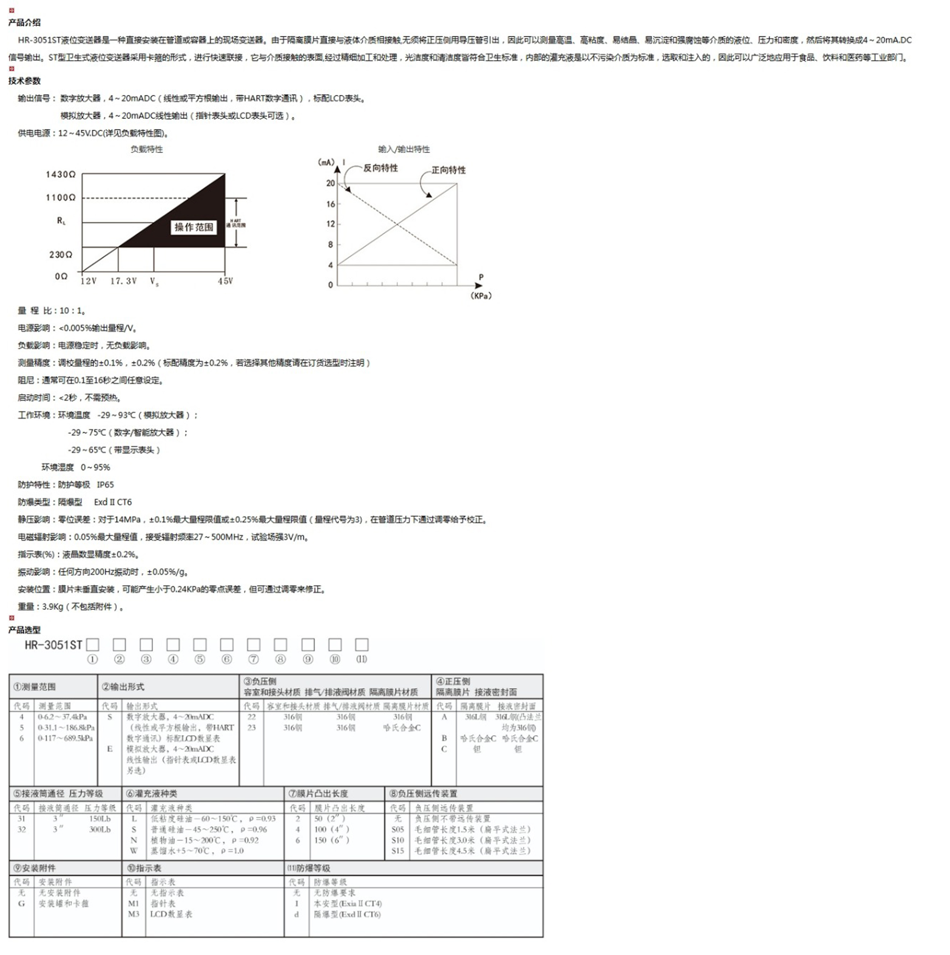 HR-3051ST液位變送器是一種直接安裝在管道或容器上的現(xiàn)場(chǎng)變送器。由于隔離膜片直接與液體介質(zhì)相接觸,無須將正壓側(cè)用導(dǎo)壓管引出,因此可以測(cè)量高溫、高粘度、易結(jié)晶、易沉淀和強(qiáng)腐蝕等介質(zhì)的液位、壓力和密度,然后將其轉(zhuǎn)換成4~20mA.DC信號(hào)輸出。